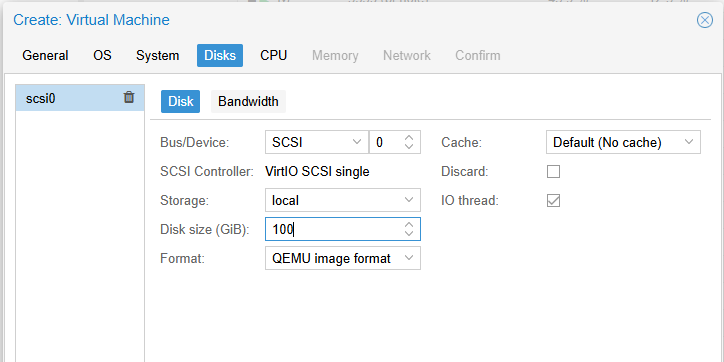 Stel de Disk size in op minimaal 100 GB, zodat je Windows updates kunt installeren. Meer voor als je ook applicaties wilt installeren.